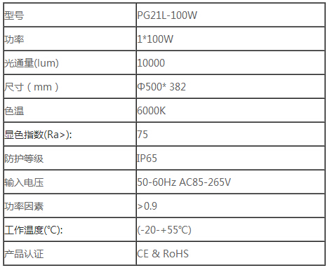 led工廠燈PG21L-100W產品參數