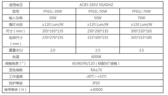 LED投光燈PF61L主要參數(shù)